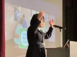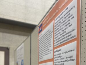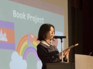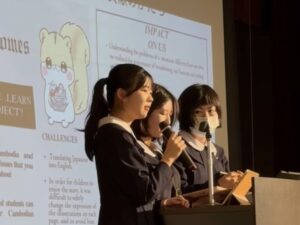 その後は、高校2・3年生の選択授業「Global Studies」の受講生による英語プレゼンテーション。高2は広告をテーマにした分析発表、高3はカンボジアの子どもたちの教育支援を目的に制作した英語で書いたオリジナル絵本の紹介と、その制作に込めた想いを語ってくれました。