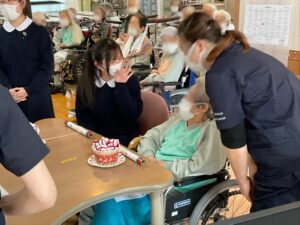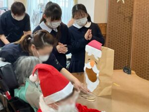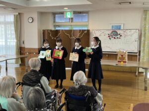 社会奉仕部 老人保健施設「舞子台」訪問 2025.12.18 お知らせ 12月13日(土)、社会奉仕部の部員が老人保健施設「舞子台」を訪問し、クリスマス会に参加させていただきました。 ゲームや歌の時間を通して、短い時間ではありましたが利用者の皆様と温かい交流を持つことができました。部員たちは、手作りのクリスマスカードとお正月メッセージカードを贈り、「ありがとう!」という言葉や笑顔をいただきました。 参加した生徒からは「楽しかった」「また行きたいといった感想が聞かれ、今後の活動への意欲も高まっています。 温かく迎えてくださった舞子台の皆様、ありがとうございました