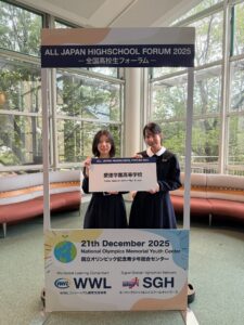 12月21日(日)に、東京の国立オリンピック記念青少 年総合センターで行われた「全国高校生フォーラム」 に、GlobalStudies受講者の高校3年生、井上柚杏さんと中野葉月さんが参加し、「Book Project」の発表を行いました。