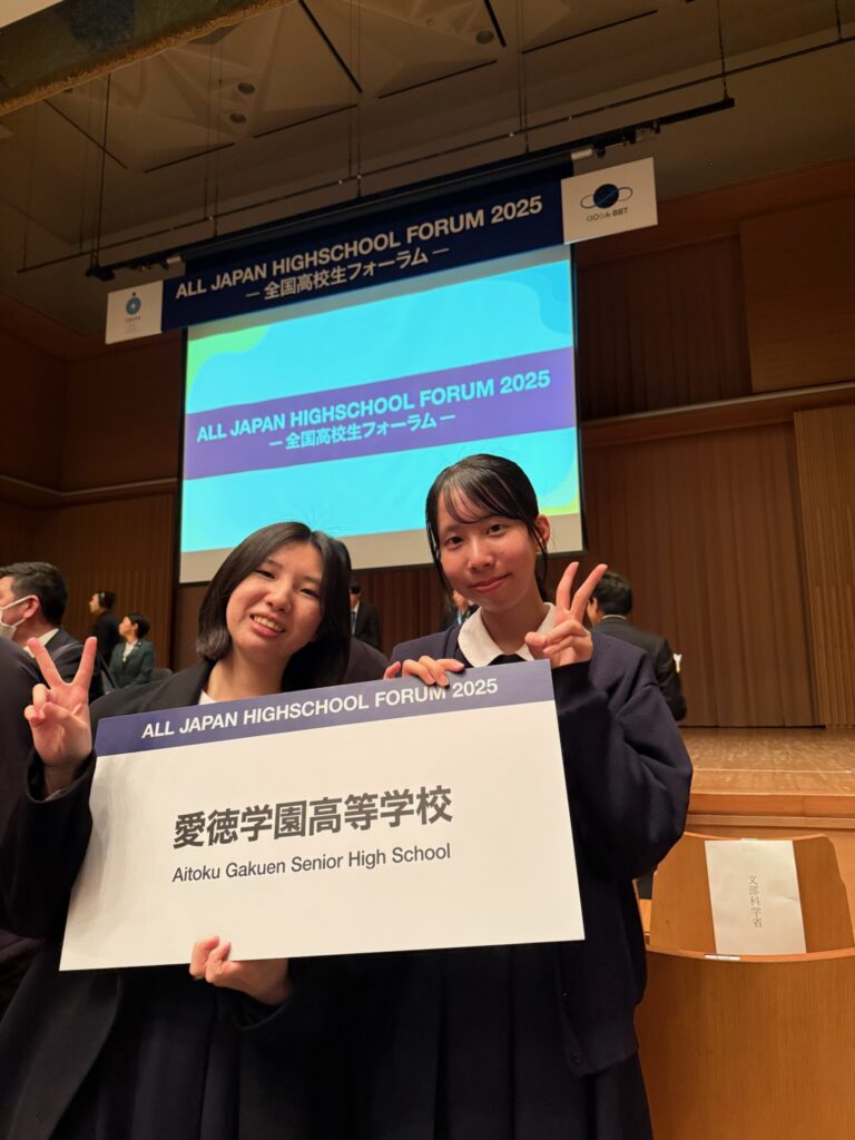 全国高校生フォーラムは、文部科学省が実施する「ワールド・ワイド・ラーニング(WWL)コンソーシアム構築支援事業」および「スーパーグローバルハイスクール(SGH)ネットワーク」に参加する全国の高校生が一堂に会し、各校で日頃から取り組んでいるグローバルな社会課題の解決策や提案について、英語でプレゼンテーションを行う場です。愛徳学園高等学校は、2025年度DXハイスクール 重点類型グローバル型の採択校として、参加しました。
